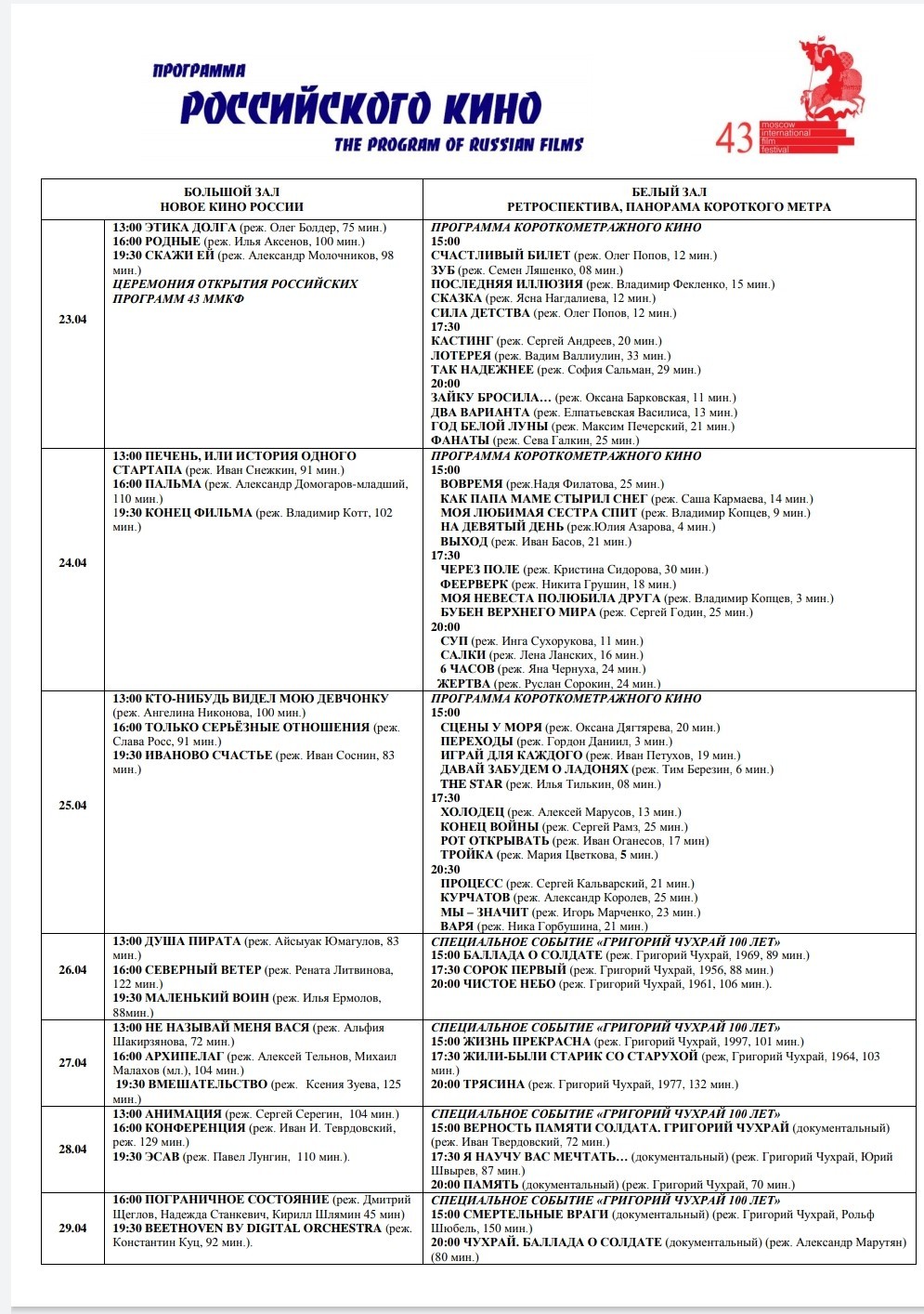 Расписание Российских программ 43 ММКФ